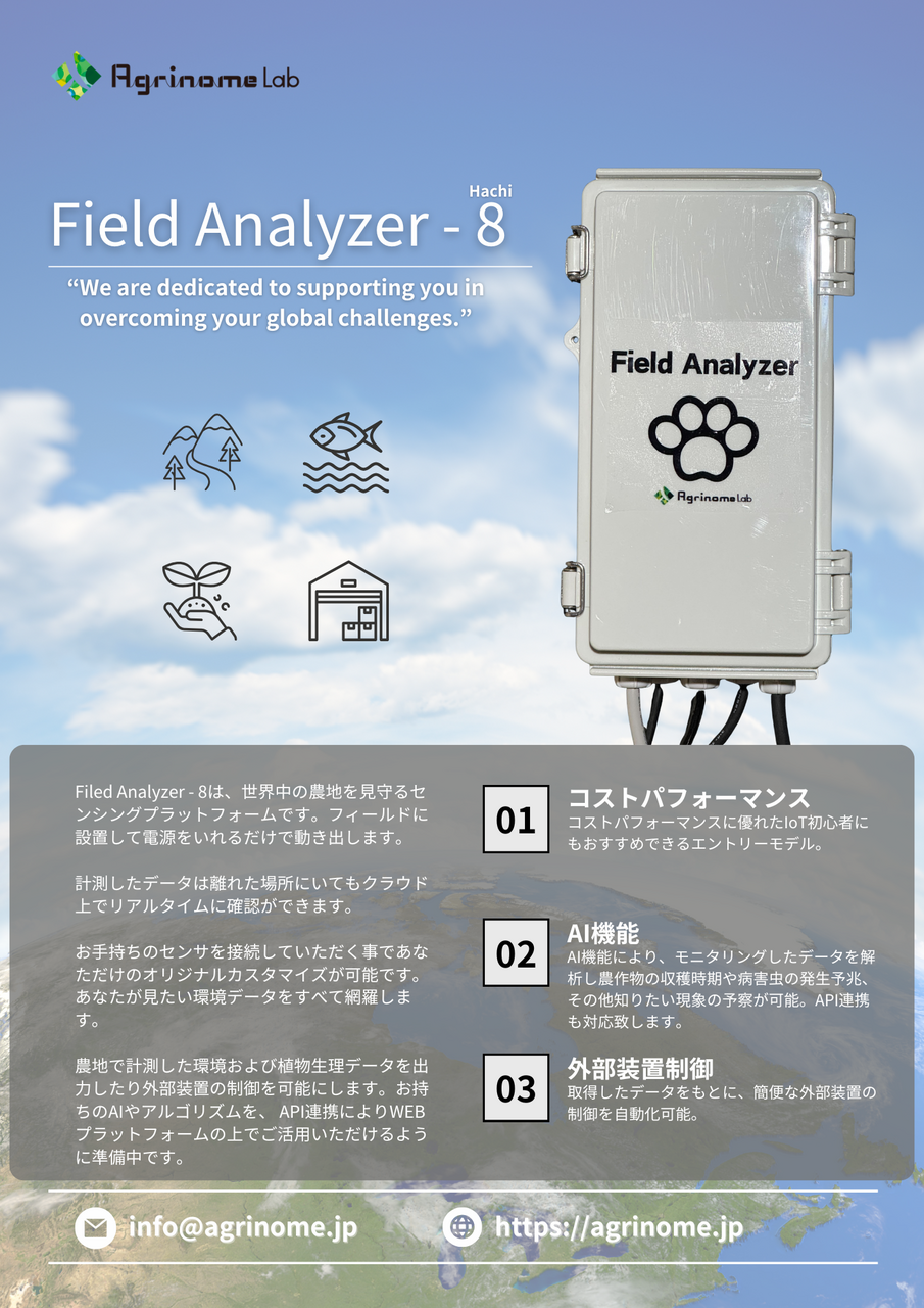 アグリノーム研究所は、環境データをリアルタイムで可視化・解析するセンシングプラットフォーム「Field Analyzer-8(Hachi、FA-8)」を正式にリリースしました。